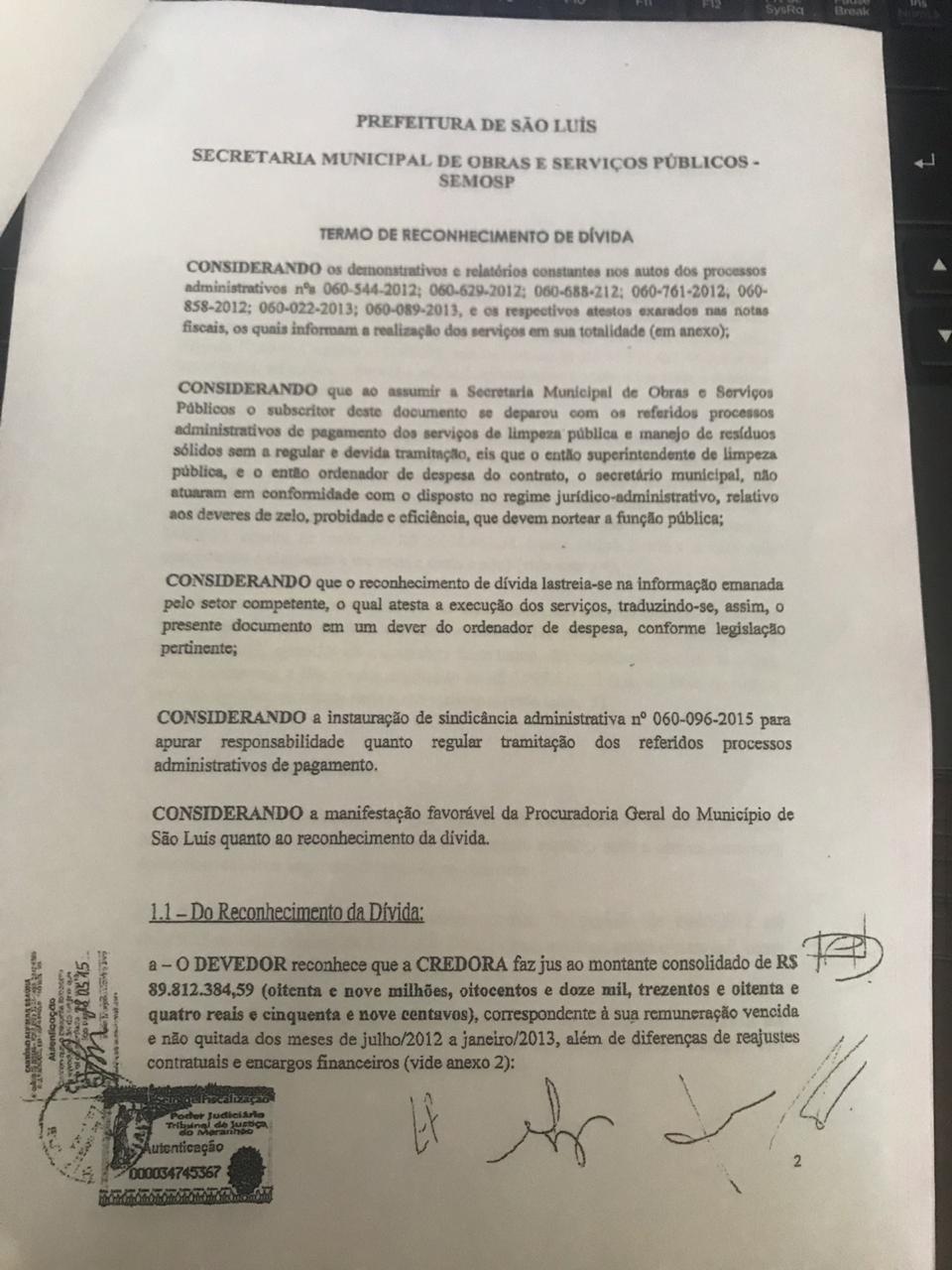 No site a verdade é bem diferente do que foi apresentado no PL. Pela letra d do item 1.1 do Termo de Reconhecimento de Dívida, verifica-se que os encargos financeiros relativos às atualizações das contraprestações pagas no valor original) relativos as competências maio/2012, junho/2012, fevereiro/2013 a dezembro/2013, apurados até a assinatura deste termo são reconhecimentos como líquidos, certos e exigíveis, e têm o valor atualizado de R$ 3.097.512,07(três milhões, noventa e sete mil, quinhentos e doze reais e sete centavos.